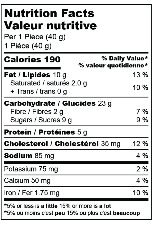 Wheat flour, Eggs, Almonds, Sugars (sugar), Semi-sweet chocolate chunks (unsweetened chocolate, dextrose, cocoa butter, soy lecithin, vanillin (artificial flavour)), Canola oil, Baking powder, Cinnamon, Salt. Contains: Egg, Wheat, Soy, Almond