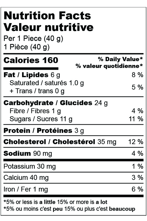 Farine de blé, Oeufs, Sucres (sucre), Canneberges séchées (canneberges, sucre, huile de tournesol), Huile de canola, Poudre à pâte, Zeste d’orange, Arôme naturel d’orange, Sel. Contient: Oeuf, Blé